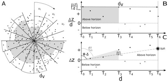 The method divides the horizon search domain into n slice directions (e.g., u = 1, 2, 3, 4,…, n = 64) per pivot point. One blocking vertex per slice u is determined as indicated by the maximum positive elevation gradient (i.e., elevation difference-to-distance ratio) Δz/d, where Δz and d are the elevation difference and horizontal distance between the pivot and each possible sky-blocking element (Figure 5B). This ratio ensures the comparison of far and tall geomorphologic features to closer, shorter topographic objects. Having a single blocking element per slice u, the zenith angle (f) of a sight line between the pivot T and the blocking TIN vertex ((Z/d)) is calculated per search slice as in Equation (8) (See Figure 5C).