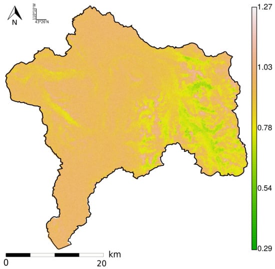 Typically, f is computed as the zenith angle of the horizon integrated across an n-direction search method (n = 8 for squared elements) and then averaged for all the compass directions to compute the ratio of visible to blocked sky hemisphere [,]. We propose to use the strategy developed in Section 3.3.2 (i.e., shadow casting) to integrate the fraction of the sky viewed from each pivot T. Computationally, the calculations would not represent an additional load since an n-directional matrix of sky-blocking elements was previously created and stored. Thus, a single f is obtained by averaging all f for the n slice search directions and dividing by 90 of full half-horizon visibility along each direction. A spatially-distributed map of f is illustrated in Figure 6. Note that narrow-valley floors in areas surrounded by tall and close hillslopes hold relatively low f values, while both flat and high elevation regions hold f values near unity.