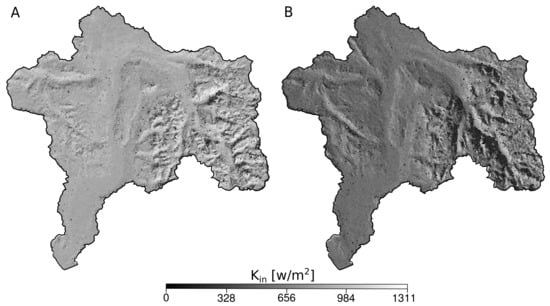 The resulting maps of instantaneous solar radiation flux (K; w/m), after including all the components from Equation (5) at each TIN element are illustrated in Figure 7A,B for two different hours (12 PM and 5 PM LST) on 20 March (Spring equinox) of year 2016. Contrasting solar radiation fluxes are observed at the two hours (12 PM and 5 PM) with the 12 PM condition (Figure 7A) receiving significantly more radiation across the entire basin, particularly for south-facing elements. At 5 PM (Figure 7B), west-facing slopes are the only landscape features that maintain comparable radiation values to the 12 PM condition. In both cases, the high variability of radiation fluxes over the east portion of the watershed reveals the shading effects by nearby, steep slopes and predominance of significant topographic heterogeneity.