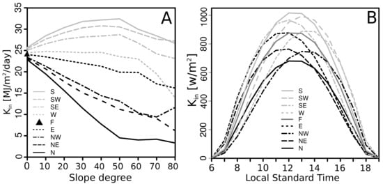 (A) Cumulative diurnal incident solar radiation (K) in MJ/m/day for different slope degrees and aspects and (B) hourly instantaneous incident radiation flux (K) in w/m for different slope aspects including flat TIN elements (F), during 20 March (i.e., spring equinox) of year 2016.