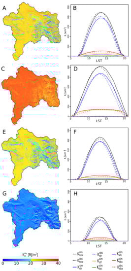 Spatial distribution of simulated cumulative daily incident radiation (MJ/m) and diurnal cycle of simulated and observed incident radiation flux (w/m) and its components in the upper Green River Basin during a typical, clear-sky day of: (A,B) spring equinox, (C,D) summer solstice, (E,F) autumn equinox, and (G,H) winter solstice. The super indices sim (solid lines) and obs (dashed lines) stand for simulated and observed values. K, K, K, K and K represent the total downwelling, direct, diffuse, atmospheric backscattered and albedo-reflected radiation components. K = K + K + K.