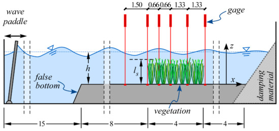 This is one of the main reasons for investigations of the interaction between vegetation and flow. Wave attenuation has been widely investigated in controlled laboratory experiments, where vegetation has often been mimicked by rigid dowels or artificial plants [24,25,26,27,28,29], as well as in field observations, where it has been limited to cross-shore transects. [30,31,32,33]. Despite the large amounts of theoretical and experimental results available in the literature, the interaction of waves with a vegetated canopy still deserves further study. In particular, the drag coefficient, which represents/includes the impact of several phenomena such as sheltering, bed interaction, and non-uniform velocity distribution [34], needs to be assessed.