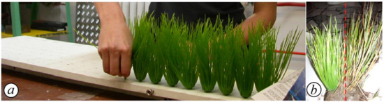 The artificial plants chosen for mimicking the real Spartina maritima are the same used in other studies aimed at investigating the transport and diffusion of floating seeds in partially emerged saltmarsh vegetation [41,42]. They are plastic plants 15 cm high, with ns = 120 stems having a diameter, , of approximately 2.0 mm. Real Spartina is compared to the present artificial plants in Figure 2b.