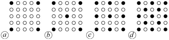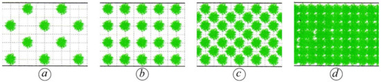 Plants distribution for the four tested configurations: (a) plants density = 43.75 plant/m2; (b) plants density = 84.5 plant/m2; (c) plants density = 156.25 plant/m2; and (d) plants density = 312.5 plant/m2.