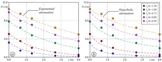 Wave height along the vegetated reach when density is = 312.5 plant/m2 and the relative vegetation height is in the range . Wave period and slope are = 1 s and = 0.08. Circles denote the experimental data, dashed line are the modeled wave attenuation either with (a) the exponential model given by Equation (6); or (b) the hyperbolic model given by Equation (4).
