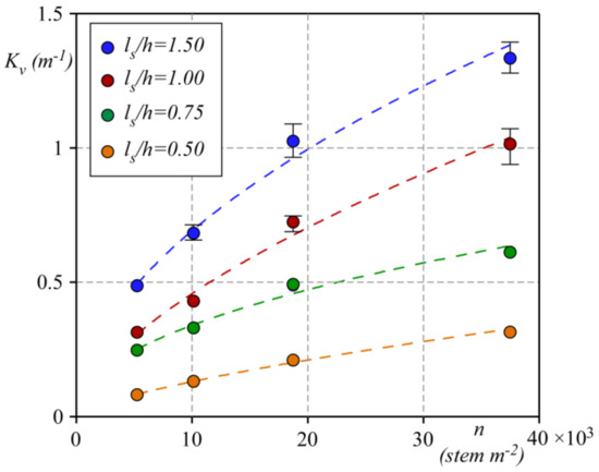 where is the bed shear stress and is the flow velocity averaged over the stem height. In the present case, the stem density is very high and drag resistance turns out to be much greater than bed shear stress; accordingly, is neglected in Equation (11). In addition, only the emergent vegetation condition is investigated, so that is the bulk flow velocity. The choice to perform the UF experiment with only emergent vegetation is essentially due to the large variability of flow velocity in the vertical direction when the vegetation is submerged [48,49]. This aspect is not taken into due account by the formulation in Equation (11).