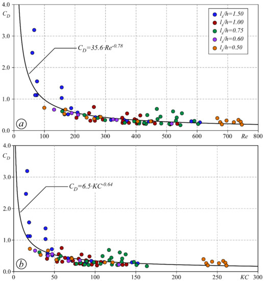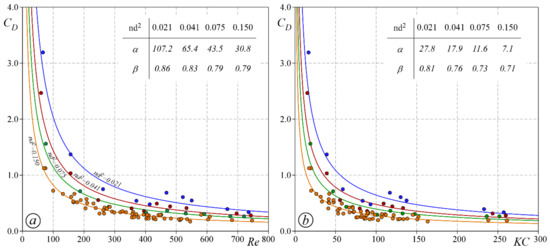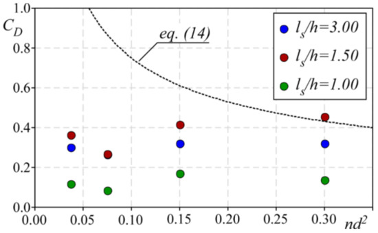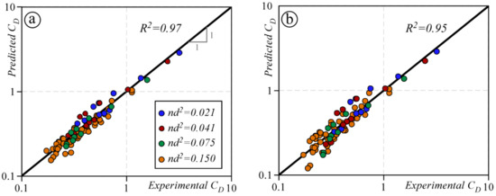 Figure 9 shows the comparison between the measured drag coefficient and that computed by Equation (14) (panel a) and Equation (15) (panel b). The data are well arranged along the line of perfect agreement, demonstrating that the proposed formulas can explain the measured values well.