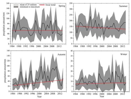 The mean precipitation amount variations of 25 stations in HRB for the spring (March to May), summer (June to August), autumn (September to November), and winter (December to February), respectively, from 1984 to 2014.