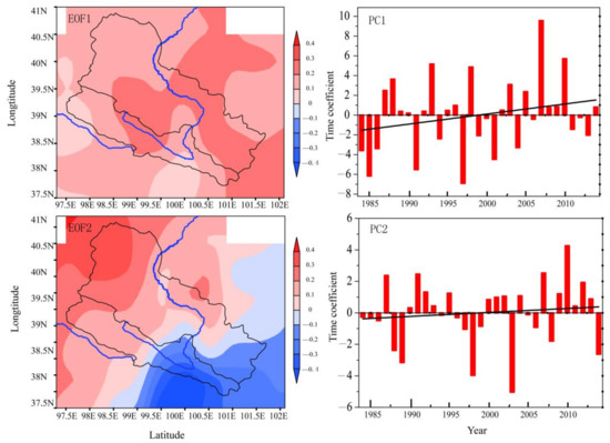 The EOF analysis demonstrates that the first EOF displayed the main features of the temporal variability in the whole basin. The increasing trend of precipitation from 1984 to 2014 may be mainly derived from changes in large-scale weather systems, which were mainly influenced by atmospheric circulation [26,27,28]. For most stations, a slight but noticeable increasing trend was also detected in precipitation at an annual scale. It was reported that the water vapor over the northwest region exhibited an increasing trend since the late 1980s [27,29], and the high-altitude wind field in Northwest China has been favorable for the transmission of water vapor from south to north in recent years [26,27]. Weakened by the Ural Mountains ridge and the East Asian trough, the westerly wind is weaker and the south wind is stronger in Northwest China [10,30,31]. Such circulation is favorable for the northward transmission of southern moisture from the Indian Ocean and the Western Pacific [27,32]. This may be the main cause of the increase in precipitation in the HRB. The second EOF displayed approximately symmetric characteristics of precipitation between the northeast and the southwest region, and it can be inferred that the opposite tendency became more and more obvious from 1984 to 2014. The main reason for this may be the impact of small- and medium-scale weather systems [14,33,34]. However, when compared with a large-scale weather system, the effect on precipitation was less significant. Previous studies also found that precipitation in the western region to the northwest of the HRB increased significantly under global warming and accelerating water circulation [7,33]. In addition, Shi et al. [6,35] found that the climate was basically characterized by the development of warm and wet weather from the end of the Little Ice Age until the 1980s, especially in Northwest China. However, the cause of the second EOF has yet to be determined.