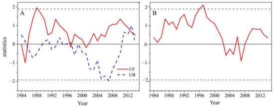 Figure 7A shows that the UF series mostly remained positive, without exceeding the significance level line. It is suggested that precipitation showed a slight increase in HRB from 1984 to 2014. There were two intersections between the UF and UB series in 1997 and 2012 (Figure 7A), respectively. The intersections suggest that the precipitation might have changed abruptly around 1997 and 2012. The moving t-test shows a significant breaking point in 1997 at a confidence level of 0.05 (Figure 7B). Such statistical detection indicates that there was a precipitation uplift around 1997. The mean precipitation was 252 mm in 1993–1997 and increased to 259 mm in 1998–2002. Thereby, the M–K test and moving t-test suggest that there was a sudden increase in precipitation around 1997. The mean precipitation was 251 mm in 1984–1997 and increased to 268 mm in 1998–2014. As shown in Figure 4, the abrupt increase was mainly caused by autumn precipitation, which increased from 37 mm in 1984–1997 to 58 mm in 1998–2014. The abrupt change corresponded to the beginning of the climate warming hiatus. The regional precipitation increased, especially in the autumn.