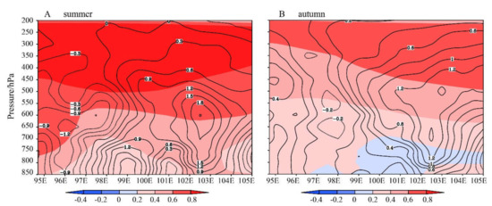 Vertical movement and water vapor transmission are also necessary conditions to induce precipitation. Figure 9 shows the changes of vertical movement from 1984–1997 to 1998–2014. It can be seen that, within the range of 98E–102E, the airflow has an ascending motion between the 700 hPa and 400 hPa height layers in autumn. In the summer, airflow showed upward movement in the eastern region, while there was downward movement in the western region. This finding illustrates that, compared with 1984–1997, the vertical upward movement of airflow was significantly stronger in 1998–2014, especially in the autumn. However, the vertical profiles of temperature changes demonstrate that thermal conditions were likely unfavorable for vertical upward movement, since warming was gradually intensified from the bottom to the top of the atmosphere. Hence, the strengthened upward movement may be caused by large-scale changes in dynamic conditions, rather than changes in local thermal conditions.