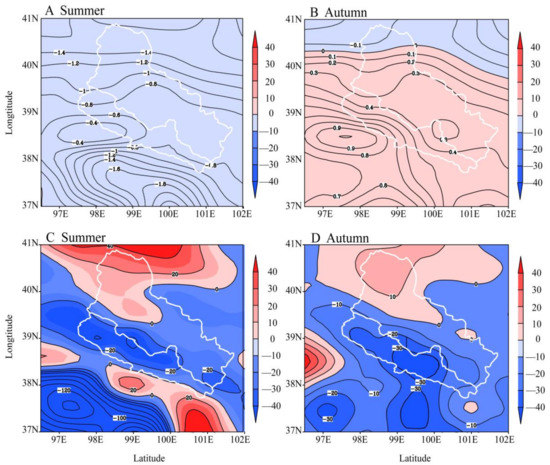 The differences (1998–2014 minus 1984–1997) in vertically integrated water vapor flux (A,B) and its divergence (C,D) for summer and autumn. The shadow indicates water vapor flux (unit: 10−7 g s−1 cm−1 hPa−1) in Figure 10A,B, and the shadow indicates water vapor flux divergence (unit: 10−7 g s−1 cm−2 hPa−1) in Figure 10C,D.