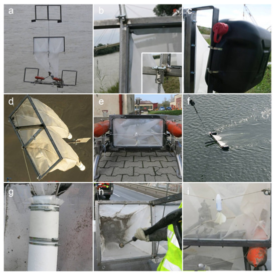 Pictures depicting the development of the device: (a) first prototype with small fins and 600 × 600 mm frames at each level; (b) steel rope and shackles, and adjustable stopper to keep the net assemblage at the right position; (c) buoyant body to ensure near-surface skimming; (d) long fin and inclination rack for good positioning; (e) centred single net near the bed; (f) upright position when inside the water; (g) sampling container to reduce the emptying time; (h) high-pressure cleaning of the nets; (i) mechanical flow meter to measure the discharge through the nets.