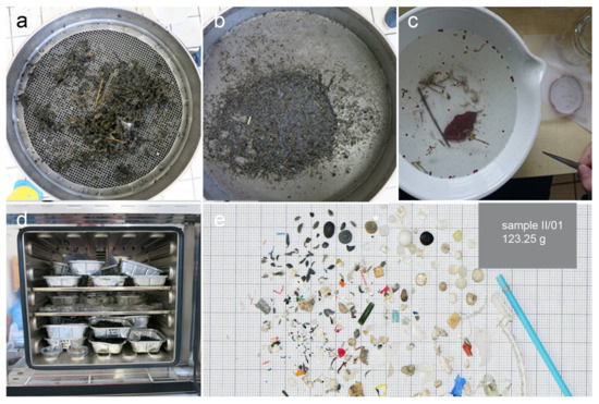 Pictures showing the sample processing: (a) and (b) examples of the sieving cascade for splitting the material, (c) manual sorting using water and NaCl, (d) samples in the drying stove, and (e) example showing plastic particles of one sample.