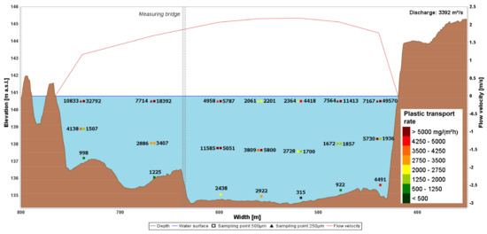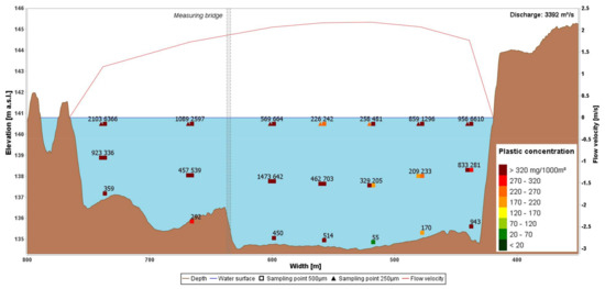 Although terrestrial environments and freshwaters are recognized as the origins and transport paths of plastics, the majority of research to date focuses on the marine environment [6]. However, studies in freshwater environments have been rapidly advancing over recent years. Horton et al. [6] gave a detailed overview of freshwater studies ranging from lakes (for example, [11,12]) to rivers [13,14,15,16,17,18,19] and river sediments (for example, [20,21]). A number of studies have been performed that addressed the transport of microplastics in riverine systems. Measurements were undertaken in recent years in tributaries of the Great Lakes [13], the Seine River [14,22], various rivers in Switzerland [15], the Rhine River [17], various river sites near Chicago [18], and the Danube River [16]. The researchers all used benthic nets [16] or surface trawls as first used by Carpenter et al. [23], described by Brown and Cheng [24], and proposed as a standard methodology for surface waters by Lippiat et al. [25]. For this methodology, a manta net is towed horizontally at the surface. The net is 60–100 cm in width, designed to capture material to a depth of 15–35 cm, and is deployed from the back or the side of a vessel for approximately 0.5 nautical miles at a speed of 1–3 knots, a duration of approximately 15 min [25]. A flowmeter is usually attached in the centre of the net orifice to allow the calculation of concentration (items*m−3) based on the filtered water volume. Due to this sampling strategy, all of these studies only address the particles floating in the near-surface layer (upper 10–30 cm of the water column). Moore et al. [26] tried to address multiple depths by using different devices including a modified large Helley Smith sampler in concrete-lined creeks near Los Angeles. Also, Dris et al. [22] addressed different depths in one point in the center of the Seine River by coupling a plankton net (addressing fibres) with a propeller-type current meter to sample down to a depth of 2 m. However, so far, no applicable methodology has existed to standardly sample the entire cross section with a multipoint method to address microplastic transport in medium and large rivers.