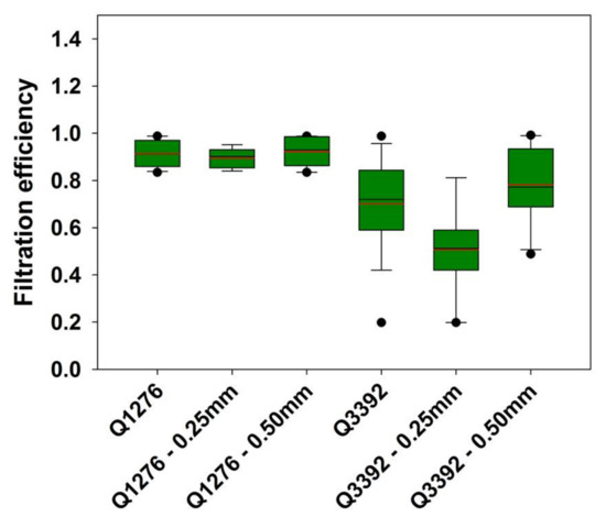 The filtration efficiency was calculated by comparing the measured flow velocities using an ADCP device to the ones obtained using the mechanical flow meter. The filtration efficiency is calculated as the ratio between the volume of water filtered and the volume of water encountered [40]. The efficiency in our case corresponds to the sustained filtration efficiency, as it was assessed after a complete sample cycle in one vertical, including already the potential clogging of the nets. Following the recommendations of Smith et al. [40], a sustained filtration efficiency of at least 0.85 should be obtained. The lowermost nets were excluded for this analysis as ADCP data is missing in the bed-near areas due to side-lobe interference. This analysis was made for two different measurements: the one from 13 January 2015, at a higher Danube discharge (3392 m3 s−1) and another at a discharge near low flow conditions (1276 m3 s−1). The filtration efficiency at the low discharge for a sampling duration of about 25 min is high for both net types (Figure 6). The minimum efficiency was found at 0.83 (Table 1); the mean value could be determined at 0.91. The difference between the 250 µm and the 500 µm net is considerably low (mean value 0.90 for 250 µm, 0.92 for the 500 µm net). Despite the reduced sampling time (approximately 5 min), the efficiency is lower for the higher discharge, especially for the smaller mesh size (250 µm). With an average efficiency of 0.52, the 250 µm net performed poorly compared to the 0.78 of the 500 µm net, indicating a faster clogging of the fine mesh at these conditions (higher abundance of fine material, primarily suspended sediments). Regarding the 500 µm net, two sample points had a filtration efficiency of around 0.50. As the material caught was comparable to samples in other nets, it might be possible that blockage of the mechanical flow meter with leaves led to an underestimation of the filtered water volume, hence the efficiency.