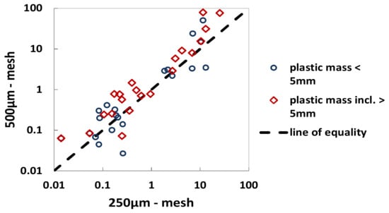 As different mesh sizes were used, the sampled plastic mass was compared for both net types. Spatial variability is high and can also be observed when using the same mesh sizes side by side (e.g., Figure 4, center point at the vertical to the right of the bridge pier). However, there is a tendency that even more material is sampled with nets of the 500 µm mesh size, as most values are found above the line of equality (Figure 7).
