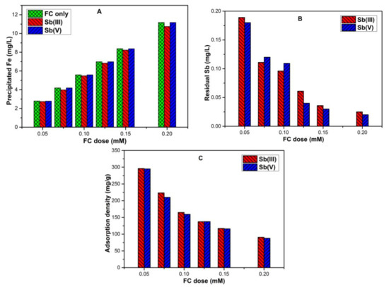 Across various FC doses of 0.05 mM to 0.2 mM (i.e., 13.51 mg/L to 54.06 mg/L), at pH 7, 1 mg/L initial Sb concentration and temperature T 25 ± 1 °C showing (A) Fe precipitation (mg/L); (B) residual Sb (mg/L); (C) adsorption densities (mg/g).