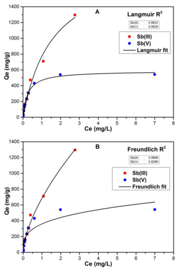 Figure 3 shows the adsorption experimental results and non-linear adsorption isotherm fittings for the analyzed data. As expected, Sb(III) showed strong adsorption ability independent of initial concentrations. The regression value (R2) for Sb(III) species for Langmuir fitting was 0.9823 while for Freundlich fitting it was 0.9896. Similarly, Sb(III) showed high adsorption affinity without any saturation point when ferrihydrite was used as a sorbent [43]. This contrasted with Sb(V), which almost reached an adsorption maximum (Qm: 586.5 mg/g). The R2 value for Sb(V) for Langmuir fitting was 0.9929 while for Freundlich fitting it was 0.8289 suggesting Sb(V) adsorption on the FC surface followed Langmuir, thus indicating a homogeneous surface of FC adsorption sites with the same energy of adsorption for Sb(V) and monolayer formation between precipitated Fe and Sb(V) [44].