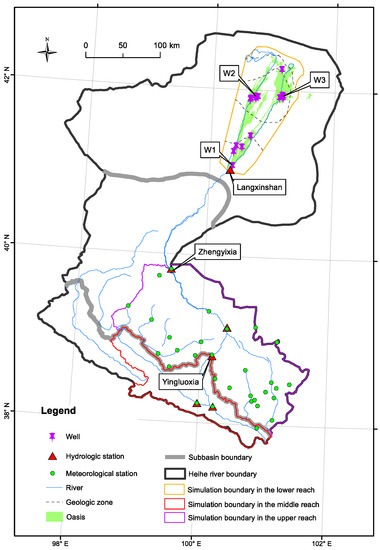 The middle reach is the dissipative area of the entire Heihe River basin, and gauged at Zhengyixia hydrological station with the drainage area of 2.56 × 104 km2 and elevation of 1000–2600 m (Figure 1 and Table 1). It is in the arid Gobi Desert with the annual average air temperature of 2.7 to 8 °C, arid index of 3.0–10.0, annual precipitation from 100 to 300 mm, and annual ET from 1200 to 1800 mm. This area is covered with 29.2% grassland and 41.4% unused area, and other land covers include agricultural area (16%), forest land (9.7%), and bare soil (3.7%). As more than 90% residents of the Heihe River basin concentrate in the middle reach, interactions between the surface streamflow and subsurface flow are prompted by the intensive human activities [23] such as constructing water supply projects, developing irrigated agriculture, reclaiming fallow land, etc.