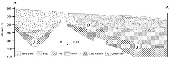 The lower reach is the other dissipative area of the Heihe River basin, and an oasis is located in the lower subbasin of the Heihe River Basin (Figure 1) with an area of 3.4 × 104 km2 and mean elevation around 1000 m. It belongs to the extremely arid area with annual precipitation less than 100 mm, average annual air temperature 8.2 °C, potential evapotranspiration more than 2000 mm, and arid index greater than 10.0. The land cover is sparse vegetation dominated by xeric shrubs and subshrubs. Due to the extremely arid climate, the streamflow of Heihe River eventually disappears in this area through evaporation and baseflow recharge, and the groundwater is the dominant water resource for the maintenance of the oasis ecosystem. Figure 2 indicates the geo-tectonic structure of the oasis. The underground aquifer system is composed of unconsolidated Quaternary sediments of 100–200 m [24,25]. The aquifers vary from a zone to a multilayered zone [24,26] with the lithological features varied gradually from gravel and pebbles to fine sands and silts [25].