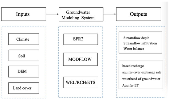 The hydrological process of the lower reach is dominated by the groundwater dynamics due to the extreme arid climate. The hydrological cycling process of the lower reach is simulated with the ground water system (GWS) which is a software program for groundwater simulation with a collection of the preeminent groundwater models [27]. The modules of GWS applied in this study are shown in Figure 5. The streamflow evaporation and infiltration vertically, and outflow horizontally of each grid cell are simulated with streamflow-routing 2 (SFR2) model. The groundwater movement from aquifers is simulated with MODFLOW [32]. The MODFLOW is a finite-difference groundwater model, which has the aquifer divided into different layers in the vertical direction and into grid cells at the horizontal level for each layer. Inputs of MODFLOW are river stage, groundwater recharge, water transfer, drainage, aquifer ET. Outputs are the cell based recharge, aquifer-river exchange rate, variation of GW head, drainage, and aquifer ET.