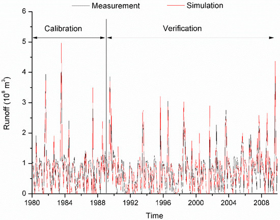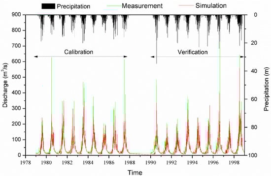 The simulated streamflow of the upper reach with HIMS model is compared with the observed streamflow in Figure 6 at monthly time step and the statistical evaluating results are listed in Table 4. The simulated streamflow well fits the observation in both the calibration and validation periods with the exception of the streamflow peaks generated by the extreme storm events. To ensure the streamflow simulation performance of HIMS model with one set of parameters for the many precipitation events, less attention is paid to the extreme storm events in the calibration process. The statistical results for the comparison of simulated and observed streamflow are satisfied at monthly time steps. HIMS model has better performance in streamflow estimation than the SWAT model with NSE 0.93 obtained by Yang et al. [34] and VIC model with NSE 0.62 by He et al. [35] for the same study area and time periods at monthly time step. It is probably due to the combined runoff generation mechanism structure of HIMS model about intensity excess and saturation excess.