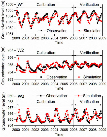 As groundwater is the major water resource in lower reach with extremely arid climate, dynamics of the groundwater is simulated with the GMS embedded with the MODFLOW model. Comparisons of the groundwater levels between the simulation and observation are conducted from 2000 to 2009 for the 15 wells, three of which are shown in Figure 8, in both the calibration and validation periods. The model simulations are decent, as indicated by the statistical parameters of MAE and RMS for the 15 wells, which are listed in Table 9 with for three wells. The simulating errors may come from the differences between the model inputs and the real lower reach boundaries, as the aquifers inputs are obtained from the maps and the borders are assigned based the investigation of western and eastern study domain. Errors may also come from the hydrological parameters which are adjusted for the six zones separately, as it is possible that the hydrological parameters change gradually among different zones.