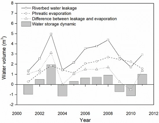 The major inflow of the lower reach is found to be streamflow percolation accounting for 78% of the total inflow, followed by the precipitation infiltration, lateral flow, and lake percolation. The major outflow is evaporation accounting for 63% of the groundwater outflow, followed by the transpiration of 23% and pumpage of 14% (Table 8). Water balance is almost closed with the annual average inflow of 3.67 × 108 m3 and outflow of 3.54 × 108 m3 from 2001 to 2009 based on the simulation of GMS (Table 8), although the lower reach is in the extreme arid area with high evaporation. It makes sense, as the ecological water division from the middle reach has been fed to this area since 2000 through regulating water consumption of the middle reach by the Chinese government with the ecological water division project (EWDP) to protect the lower reach from the desertification process [38]. Water storage dynamics of the lower reach is plotted in Figure 9 from 2001 to 2011 together with evaporation, streamflow percolation, and the difference between the evaporation and streamflow percolation. We find the fluctuation status of the water storage is the same as that of the streamflow percolation, and the water storage changes is lower than the difference between the streamflow percolation and evaporation. Groundwater level of the entire lower reach increases at the annual pace of 0.02 m in the period of EWDP with the negative values of water storage in 2001, 2004, 2009, and 2010, and positive values in the rest years.