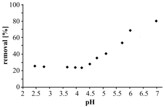 Evidently, Taurit can release some compounds into aqueous solutions followed by an increase in pH. At pH values > 7.0, metal removal is increased due to the formation of metal hydroxide precipitation. Presumably, protons are bound on the Taurit surface and ions are released—i.e., Na, K, Ca, etc.—by carbon into the solution (see Section 3.2). This behavior has been observed also at natural adsorption materials on carbon basis [20].