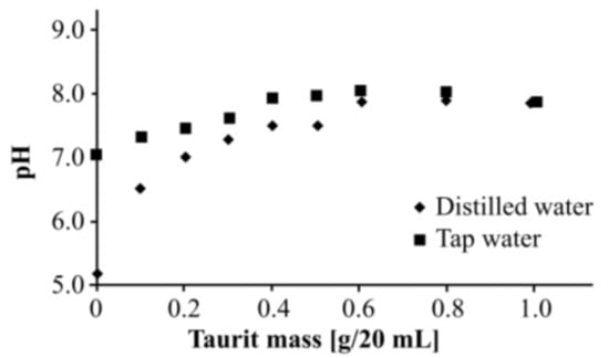 Taurit may contain soluble compounds which could influence the pH value. Therefore, the impact of different Taurit masses on the pH was investigated. Figure 2 shows the results.