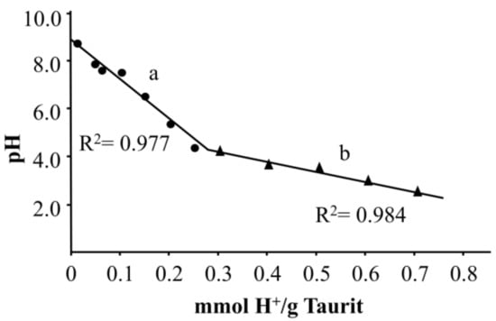 Despite the lack of detailed information about the structure and surface area of Taurit, it can be assumed that ion exchange processes are responsible for this behavior. In the neutral or weak alkaline region, the surface of Taurit is covered with cations like K+ and Ca2+. The functional groups on the surface of Taurit have a weakly acidic character, i.e., protonation takes place at pH ≤ 8.0 and the metal ions are dissolved. These ion exchange processes evidently play an important role. The course of the graph is typical of different buffer systems of soil. The decrease in pH is dependent on the kinetics and the quantity of buffer substances. For pH > 4.0, an ANC of 59 mmol H+ kg−1 pH−1 was determined. For pH < 4.0, ANC was 240 mmol H+ kg−1 pH−1. Table 2 shows some buffer capacities of different types of soil [9].