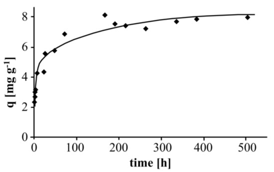 Figure 4 shows the long-term adsorption behavior of Zn(II) at pH 5.6 (distilled water) at room temperature (5 g Taurit, 500 mL distilled water, pH 5.6, 110 mg L−1 Zn(II)).