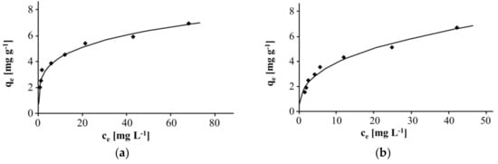 The pH was monitored and maintained ≤7.0 at all times. At this pH, the soluble compounds Zn2+ and Zn(OH)+ are the main species. Figure 5 shows Freundlich isotherms for the adsorption of Zn(II) on Taurit in distilled water and tap water, respectively (T = 25 °C, 0.1–1.0 g Taurit, 20 mL water, 100 mg L−1 Zn(II)). The pH was 5.6 in distilled water and 7.0 in tap water.