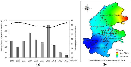 (a) Changes in groundwater exploitation and average water level in 2004–2013; (b) Spatial distribution of groundwater level and location of monitoring wells in 2013.