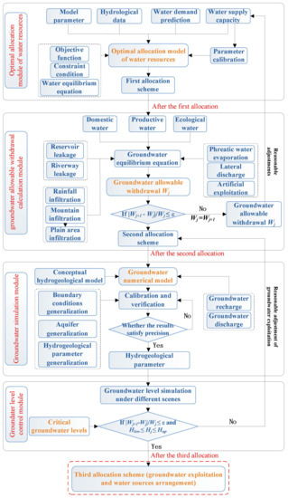 Many models have been developed to optimize groundwater exploitation and address the impact of groundwater overexploitation. Commonly used methods for groundwater simulation include finite difference method, finite element method, boundary element method and finite volume method. Mehl and Hill [10] proposed a new method of local grid refinement for two-dimensional block-centered finite-difference meshes in the context of steady-state groundwater flow modeling. Wang et al. [11] proposed a groundwater flow domain decomposition model coupling the boundary and finite element methods. However, Anderson and Woessner [12] pointed out the accuracy and reliability of groundwater numerical models depended critically not only on the simulation method but also on the properly generalized conceptual hydrogeological model. Recent decades have also witnessed significant progress in the development of groundwater simulation software based on the conceptual hydrogeological model, such as the groundwater simulation modeling system (GMS) [13], modular three-dimensional finite difference groundwater flow model (MODFLOW) [14], finite element groundwater flow modeling software (FEMWATER) [15], and finite element subsurface flow system (FEFLOW) [16]. These models have achieved remarkable success in investigating groundwater levels [17], groundwater mass balance [18], salt transport in coastal aquifers [19,20], groundwater quantity balance [21], impact of predicted climate changes on groundwater flow systems [22], sustainable groundwater management [23,24], and groundwater irrigation [25]. However, given the “natural-artificial” dualistic characteristics of the water cycle system [26], water resources allocation can have significant impacts on the groundwater recharge and discharge, resulting in significant changes in groundwater exploitation and consequently changes in water level. Thus, groundwater numerical models coupled with optimal allocation of water resources can provide a more effective way to simulate groundwater in complex regions.