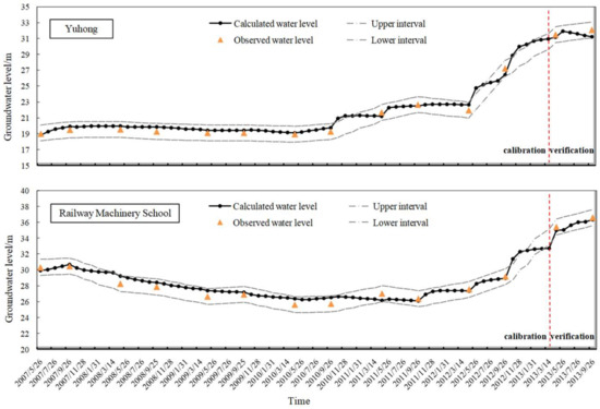 Annual changes of groundwater levels for Yuhong and Railway Machinery School wells in the calibration and verification periods, respectively.