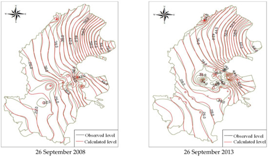The spatial distribution of groundwater levels in calibration and verification periods is shown in Figure 5. Due to the influence of concentrated groundwater exploitation in the urban district, the spatial distribution of groundwater levels is very complex with some fitting errors. However, the groundwater levels in the other five districts with less groundwater exploitation are basically regular, and the model fits well.