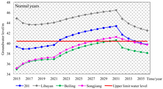The recharge and discharge of groundwater obtained from the second allocation scheme and precipitation in normal years are put into the groundwater numerical model to simulate changes in groundwater levels. We assign 22 stress periods for future prediction from 1 January 2014 to 1 January 2036. Time step is one year. Figure 6 shows that the groundwater levels of water sources (201, Libayan, Songjiang and Beiling) are higher than the upper limit of water level in 2014–2030, and the average groundwater level is increased by 2.52 m. At the beginning of 2034, the groundwater level of Libayan is expected to be 2.1 m higher than the upper limit of water level, whereas that of other water sources is expected to lower than the upper limit of water level. It is also noted that the groundwater levels of all water sources in simulation period are higher than the lower limit of water level. The increase and then decrease in groundwater level coincide well with the decrease and then increase in groundwater exploitation.