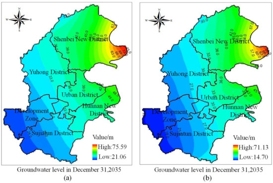 The upper limit of groundwater level in the Urban District with various underground structures and subways is determined primarily based on the anti-floating design water level of subways and the waterproof design water level of underground structures; while that in the other five districts with large well-canal irrigation regions is determined primarily based on the critical groundwater level for soil salinization [52]. According to the hydrogeological conditions of phreatic water aquifer, the maximum drawdown should not exceed 2/3 of aquifer thickness, and the lower limit of groundwater level is the difference between ground elevation and 2/3 of aquifer thickness [53]. The critical groundwater levels for different subareas are calculated by Equations (8)–(10) (Table 3). Table 3 shows that the average upper limit of water levels is 37.72 m, the average lower limit of water levels is −3.18 m, and the average aquifer thickness is 66.01 m. The minimum aquifer thickness is observed in the Urban District, indicating that the aquifer is thin with low water abundance, and thus it is imperative to control groundwater level within the critical groundwater level.