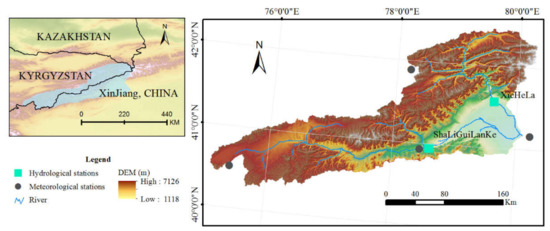 The Aksu River Basin is located west of the Xinjiang Uygur Autonomous Region, east of the Republic of Kyrgyzstan, and southeast of the Republic of Kazakhstan, enclosed between latitudes 40°16′–42°28′ N and longitudes 75°4′–80°18′ E with an area of 4.29 × 104 km2 (Figure 1). The Aksu River is the largest water system on the southern slope of the Tianshan Mountains, with two main headwater tributaries, the Kumalak River and Toxkan River. The Toxkan River originates from the Artbash Mountains, with a length of 457 km and a catchment area of 2.91× 104 km2. The Kumalak River is 293 km long and originates from the Hantengri Mountains, with a catchment area of 1.38 × 104 km2. Each tributary has a hydrological gauging station: Shaliguilank (SLGLK) on the Kumalak River and Xiehela (XHL) on the Toxkan River. The rivers are mainly fed by snow and glacier melt water from the mountainous regions.