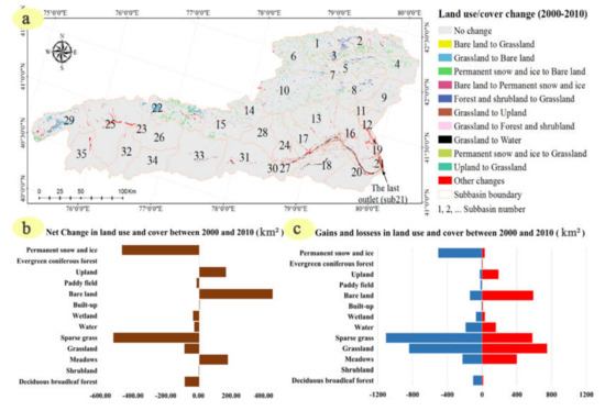 Historical land use/cover change in the Aksu River Basin from 2000 to 2010: (a) change in the spatial pattern of land use and land cover; (b) net variation in the quantity of land use/cover type; and (c) gains and losses of land use/cover types.
