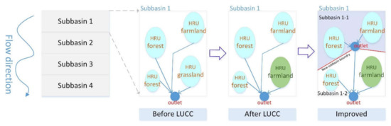 The principle of sub-basin segmentation is to use the relative spatial position of LUCC to divide the sub-basin into further multi-sub-basins based on the relationship between upstream and downstream. For example, although the land use/cover has changed (grassland HRU changed to farmland HRU), the hydrological elements of all HRUs (e.g., surface runoff, lateral flow, and ground flow) will directly collect at the outlet of sub-basin 1 without considering the spatial position relationship. After LUCC occurred, the outlet of sub-basin 1 does not change, but the hydrological process elements of the forest HRU and farmland HRU preferentially move toward the outlet of sub-basin 1-1, then pass sub-basin 1-2 to the original outlet of sub-basin 1 (“Improved” in Figure 4). Therefore, this approach can reallocate the hydrological elements in a sub-basin.