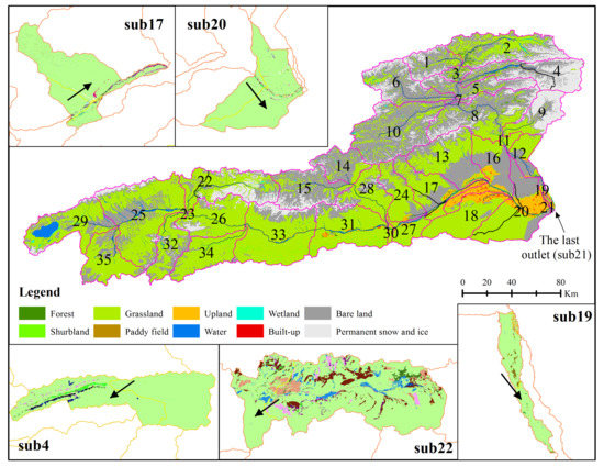 Typical sub-basin segmentation results based on land use/cover change in sub-basins (SUB) 4, 17, 19, 20, and 22 (the black arrow points to the direction of the flow).