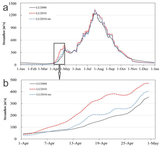Peak flow in summer exceeded 1300 m3/s and low flow decreased to 20 m3/s in winter (Figure 6a). Based on the comparison of simulated annual average daily streamflow results between the base period model (LU2000, which is driven by land use/cover data for 2000) and the changed period models (LU2010, which is driven by land use/cover data for 2010 (not improved); and LU2010-im, which is driven by land use/cover data for 2010 (improved)), the latter (with less grassland cover and more bare land) had higher streamflow in spring. The impact of LUCC was considerable in the hydrographs (Figure 6). The LU2010-im with the same change trend (reduced grassland and expanded bare land) showed a different response: the peak flow (400 m3/s) in spring based on LU2010-im was higher than that of the base period model (350 m3/s) and lower than that based on LU2010 (480 m3/s), whereas the peak flow in summer based on LU2010-im was similar to that of LU2010 and much lower than that of the base period model.