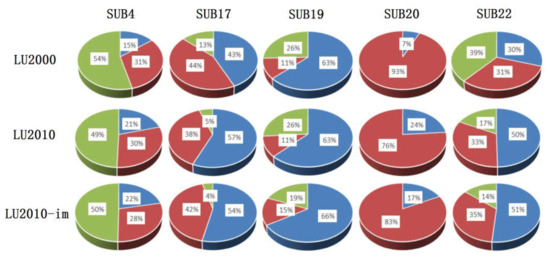 To analyze the effects of LUCC on streamflow on the sub-basin level, we considered the variation of surface runoff, lateral flow, and groundwater flow in detail. We selected sub-basins with clear LUCC (sub-basins 4 and 22 in the upstream; sub-basin 17 in the mid-stream; and sub-basins 19 and 20 in the downstream) as typical sub-basins to analyze LUCCIHP. The proportion of the flow components of the LU2000 model can be summarized as follows: groundwater flow dominated in the mountainous areas; lateral flow was the major flow component in the downstream; and the three flow components were equally important in the mid-stream (Figure 7). The proportion of flow components was distinct due to the various combination of the key factors, such as land use and land cover, slope and aspect, soil properties, and rainfall intensity.