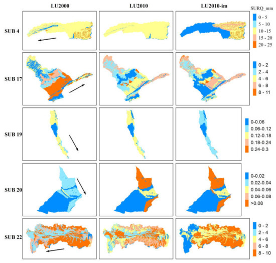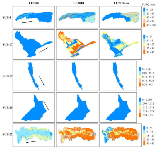 Spatial distribution of surface runoff (mm/month) at the HRU level (mean 2002–2007) for the LU2000, LU2010, and U2010-im models in sub-basins. The arrow indicates the flow direction.