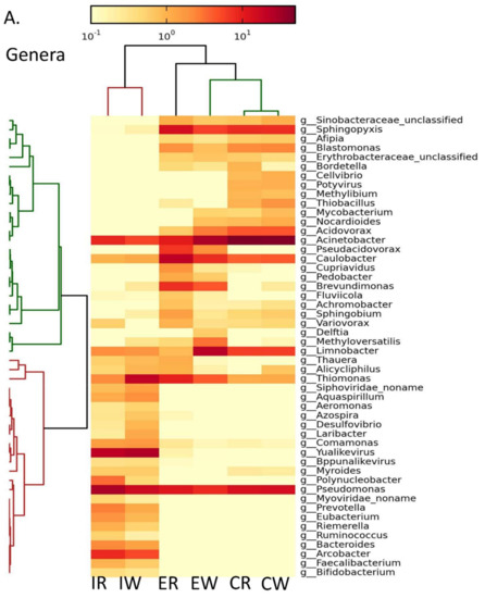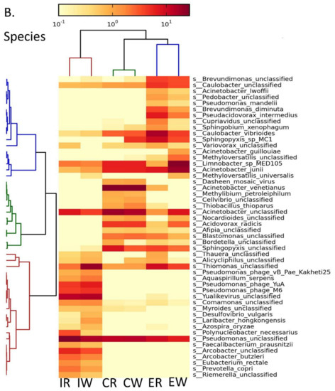 Heat map representing relative abundances of genera (A) and species (B), detected in the wastewater samples collected in July, October and November 2015. Colored scale bar represents the relative abundances for each heat map. IR: Influent-retentate, IW: Influent-wash, ER: Effluent-retentate, EW: Effluent-wash, CR: Chlorinated Effluent-retentate, CW: Chlorinated Effluent-wash.