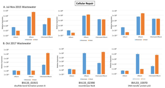 The largest category of genes upregulated in both effluents were involved in cellular repair (Table 1). Two of the most upregulated genes in this category are BVL33_14490 and BVL33_15970 which encode for a SPOR domain-containing protein and a DNA transfer protein, p32, respectively. These genes are highly upregulated in the retentate samples (329.6 and 250.5 times in the effluent retentate and 425.3 and 493 times in the chlorinated effluent, respectively). These genes were upregulated 2.13 and 2.56 times in the effluent wash and 3.8 and 21.17 times in the chlorinated effluent wash.