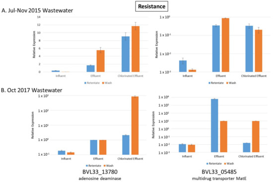 In both effluents, four different efflux pumps were upregulated among genes responsible for resistance. One of these genes, BVL33_02685, a sodium:proton antiporter, was upregulated 27.5 and 2.57 times in the effluent retentate and wash, respectively, and 144.50 and 7.71 times in the chlorinated effluent retentate and wash, respectively (Table 1).